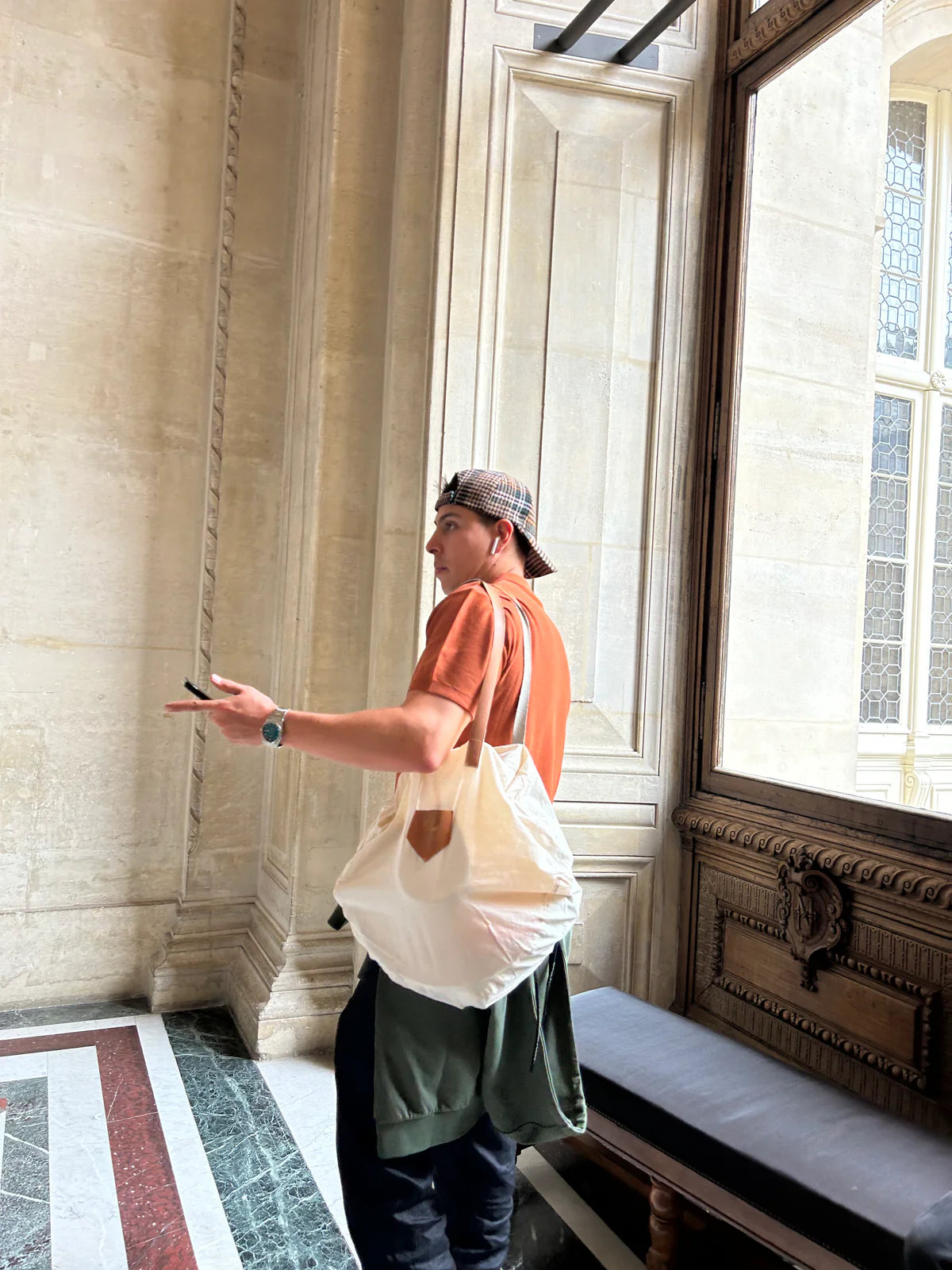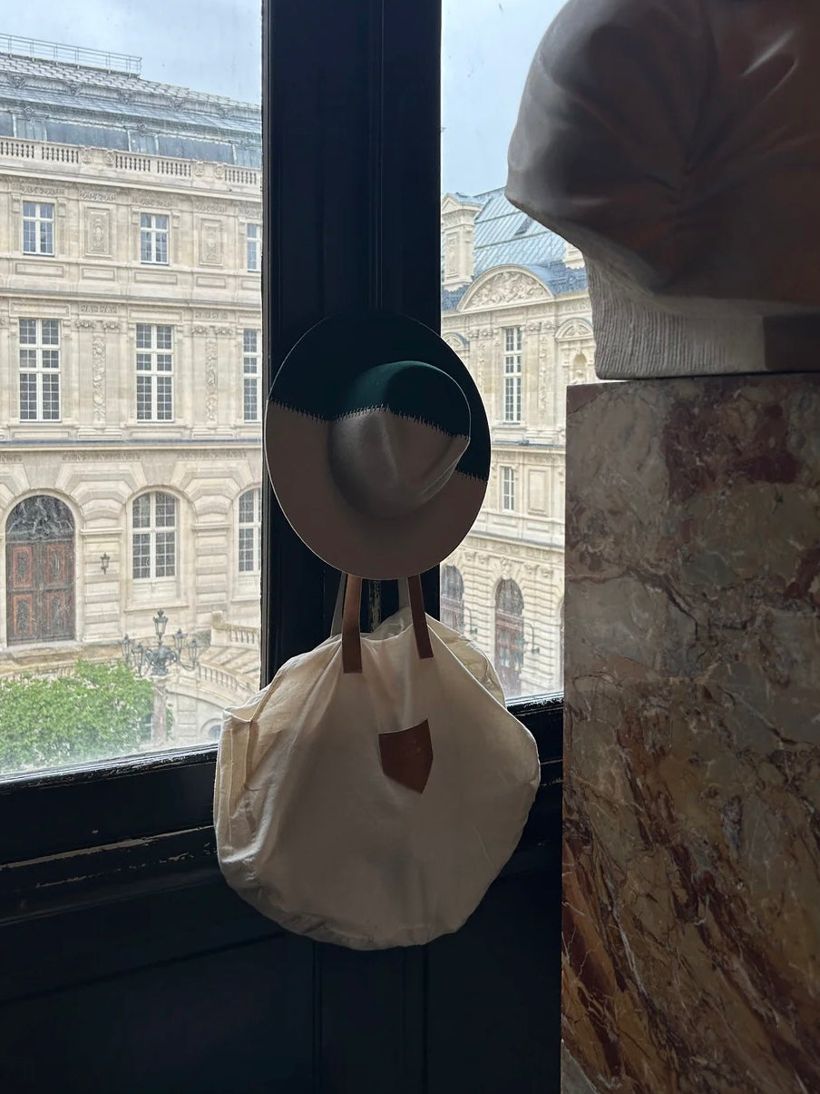 Mantenga el sombrero siempre en su bolsa de lino, protegida del polvo, y guárdelo en un lugar fresco para conservar su estructura.